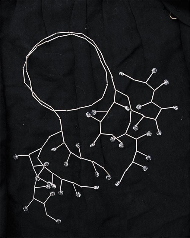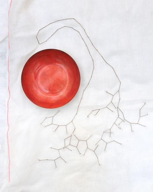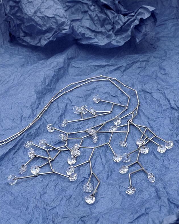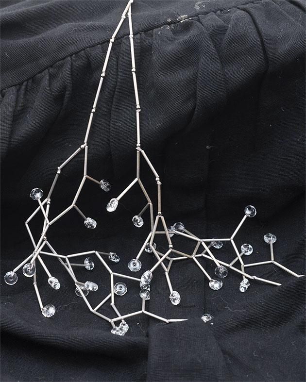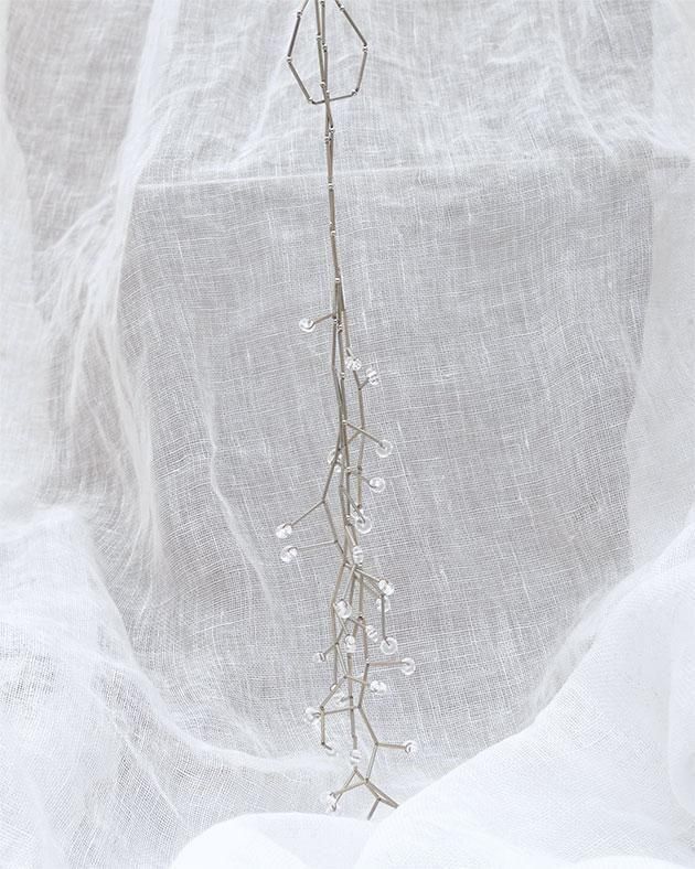 小枝の先に宝石みたいな小さな実がたわわになって、風が吹き抜けさわさわ揺れる。ささやかな自然の揺らぎが心に微かな気配を刻む。紅い実はいつの間にか透明の結晶になってきらきら輝き出す。その刹那を切り取ってカタチをつくる。デコルテで軽やかに揺れるアクセサリーが生まれる。