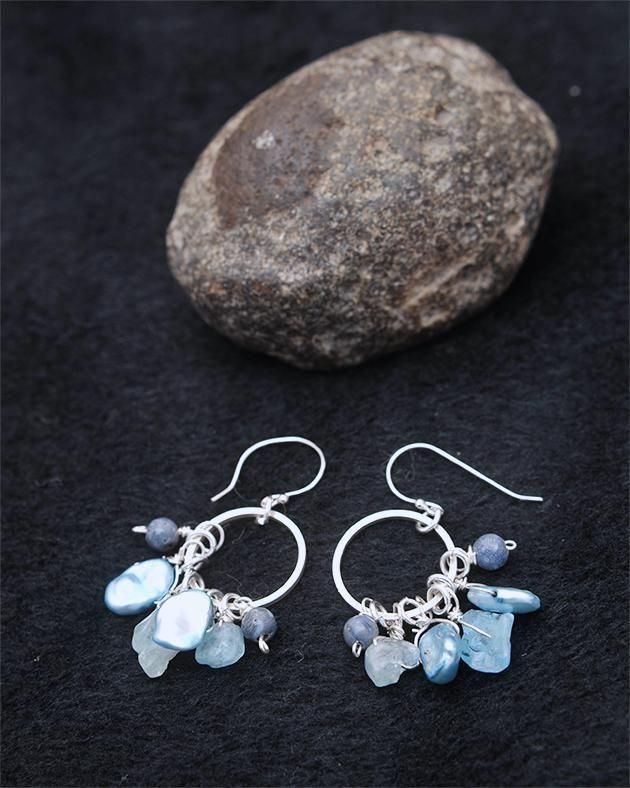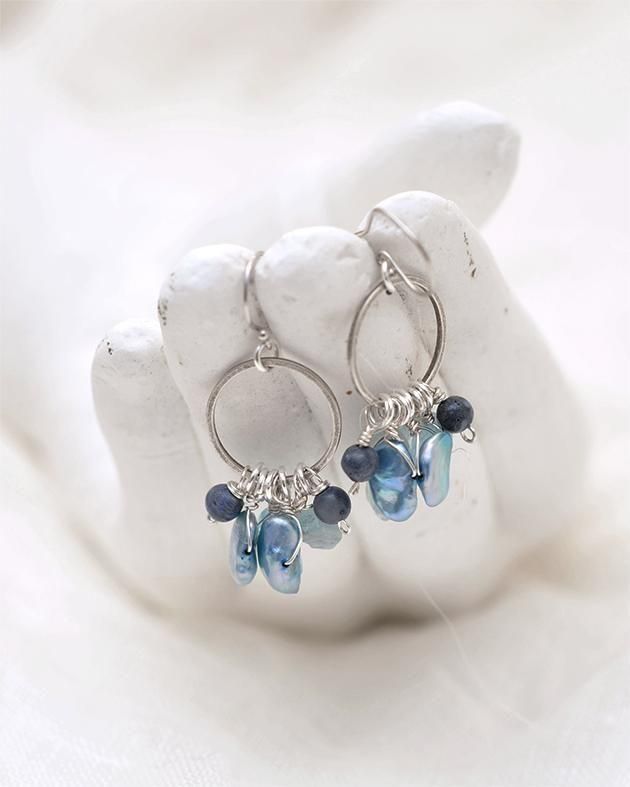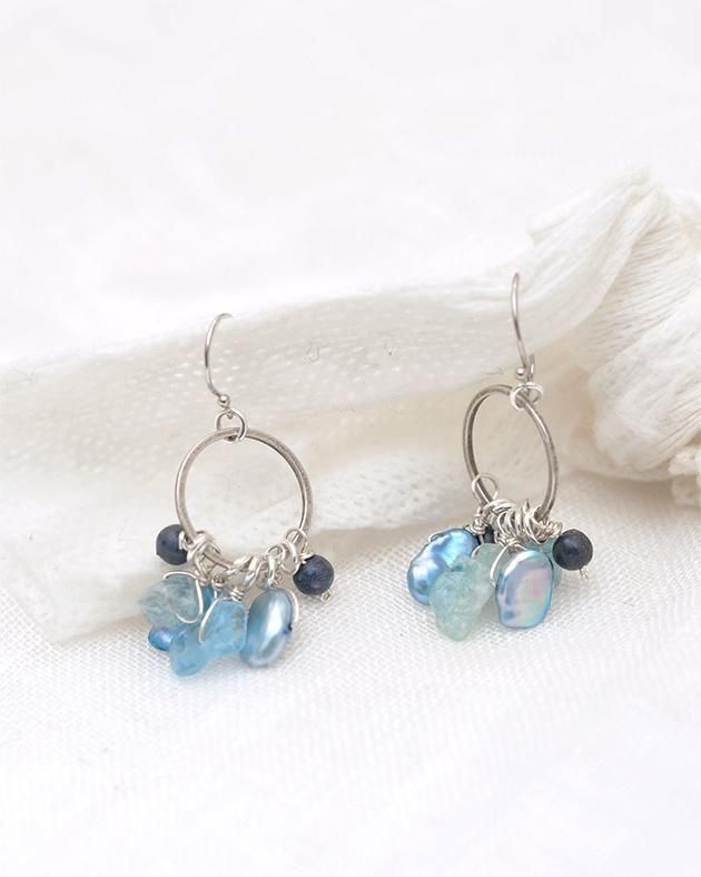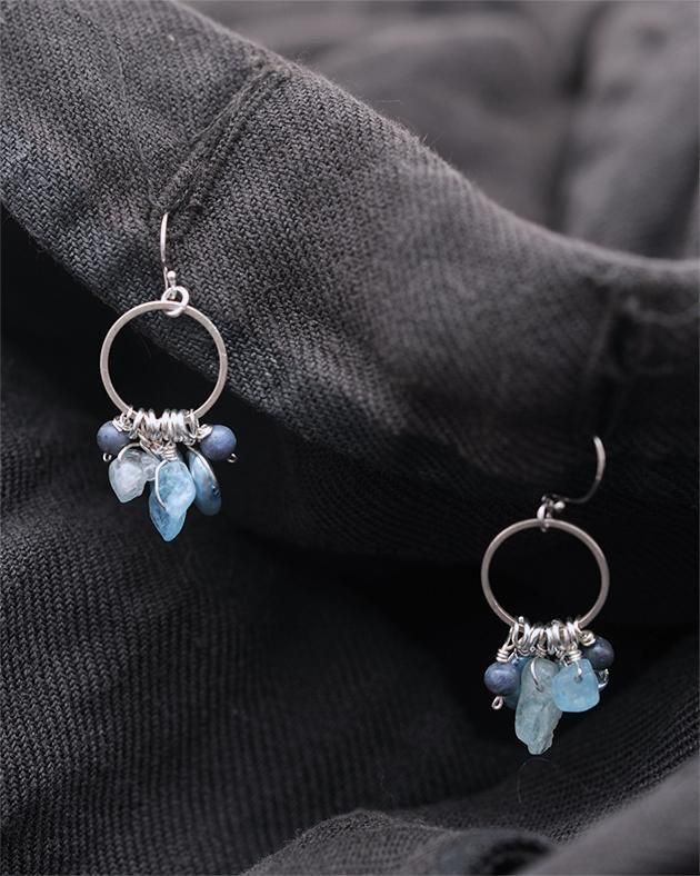 (素材) ブルースポンジサンゴ、アクアマリン チップス、ケシパール ブルー、シルバーリングパーツ 、丸カン 小、アーティスティックワイヤーノンターニッシュブラス0.5、アーティスティックワイヤーノンターニッシュブラス0.4、イヤリングパーツ