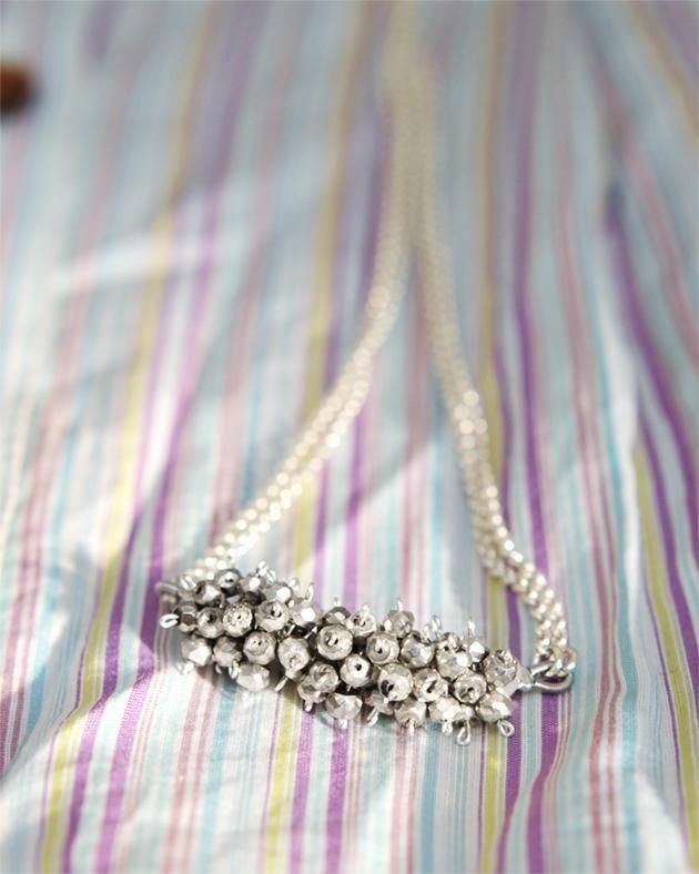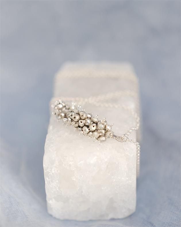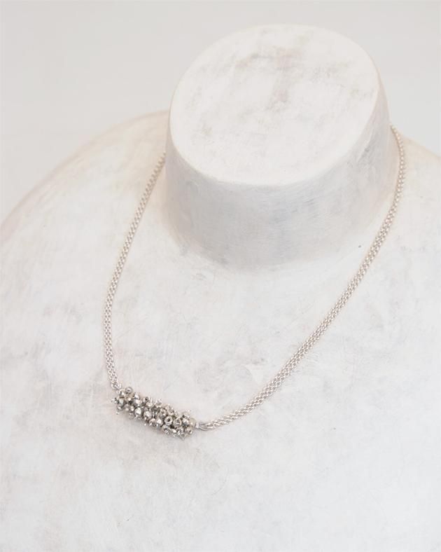 シルバーにコーティングされたパイライトがボリュームを作り出して、繊細で柔らかな表情のチェーン使いでシンプルにまとめ上げる。パイライトの房の軸となっているのは、ビーダロン社の7ストランドワイヤー(7つのワイヤーを撚り合わせたナイロンコートワイヤー)。シルバーで統一された房が、ストイックな印象の中に遊び心を感じさせる。季節を問わず、幅広いコーデに対応している、永く使える新定番。