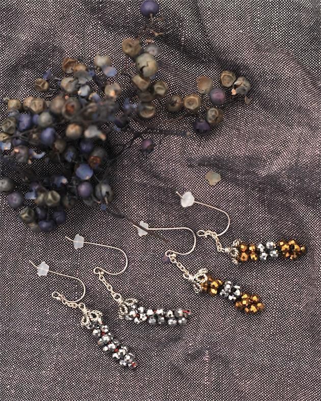 この季節、街は光に溢れる。ゴールドとシルバーの輝きを凝縮して、ハレの場に相応しいシリーズ。コーデの中で燦然と輝き、心沸き立たせるネックレスとイヤリング・ピアスができ上がりました。メタリックなパイライトがイキゞ存在感を放つ。ゴールドとシルバーがマッチングして交差する[ルリアS+G]、シルバーで統一され隙間から顔をのぞかせるレッドがアクセントをつくる[ルリアSV]。ネックレスとイヤリング・ピアスをお揃いでつけると一層煌びやか。