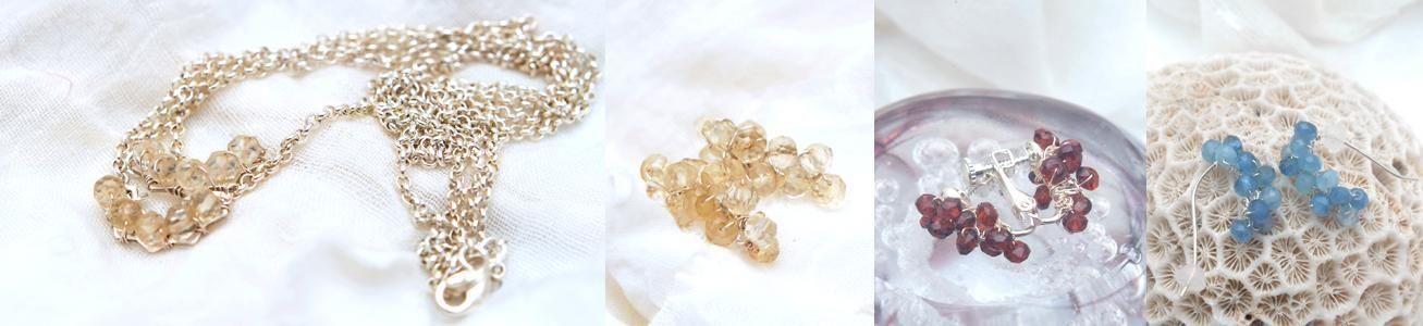 小枝の先に宝石みたいな小さな実がたわわになって、風が吹き抜けさわさわ揺れる。ささやかな自然の揺らぎが心に微かな気配を刻む。紅い実はいつの間にか透明の結晶になってきらきら輝き出す。その刹那を切り取ってカタチをつくる。デコルテで軽やかに揺れるアクセサリーが生まれる。